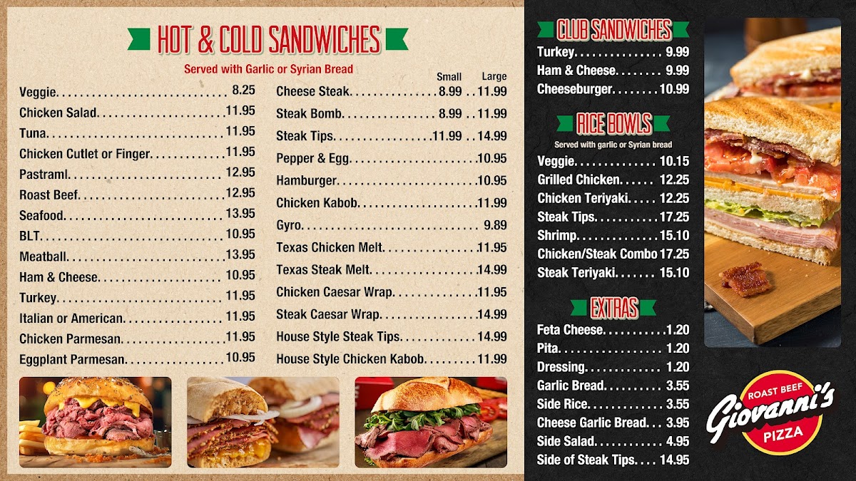 Welcome to Giovanni's Roast Beef & Pizza, your go-to destination for flavorful Italian fare nestled in Hooksett, NH. Specializing in both hearty sandwiches and delectable pizzas, Giovanni's menu is crafted for true food enthusiasts. The star of the show? The Margherita Pizza, topped with fresh basil, tomatoes, and mozzarella, offers a classic twist, while the Pollo Pizza combines grilled chicken and alfredo sauce for a satisfying bite.
